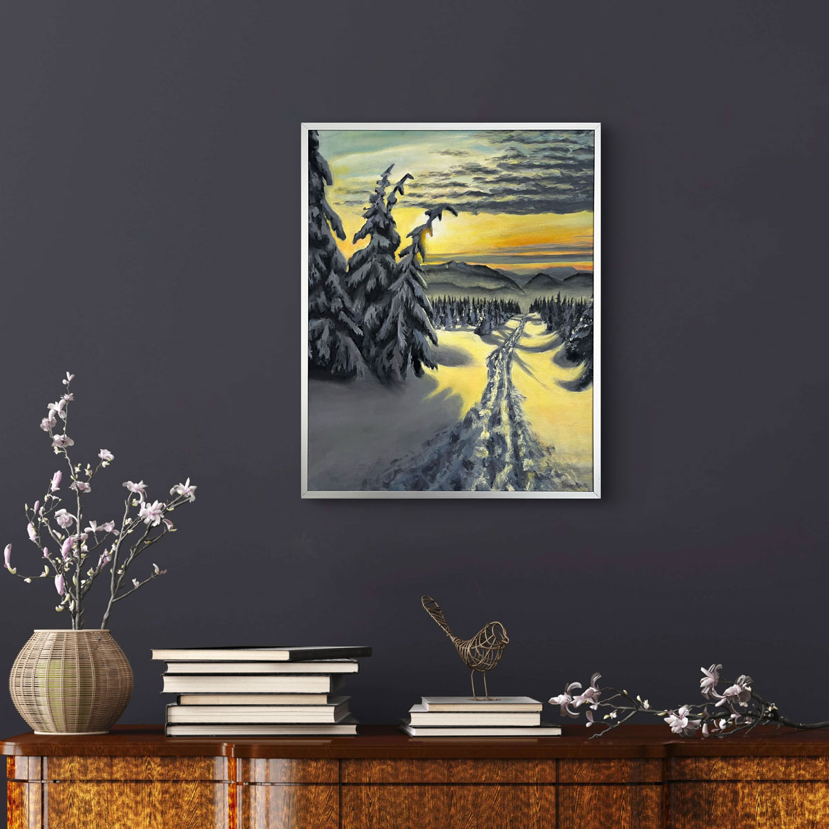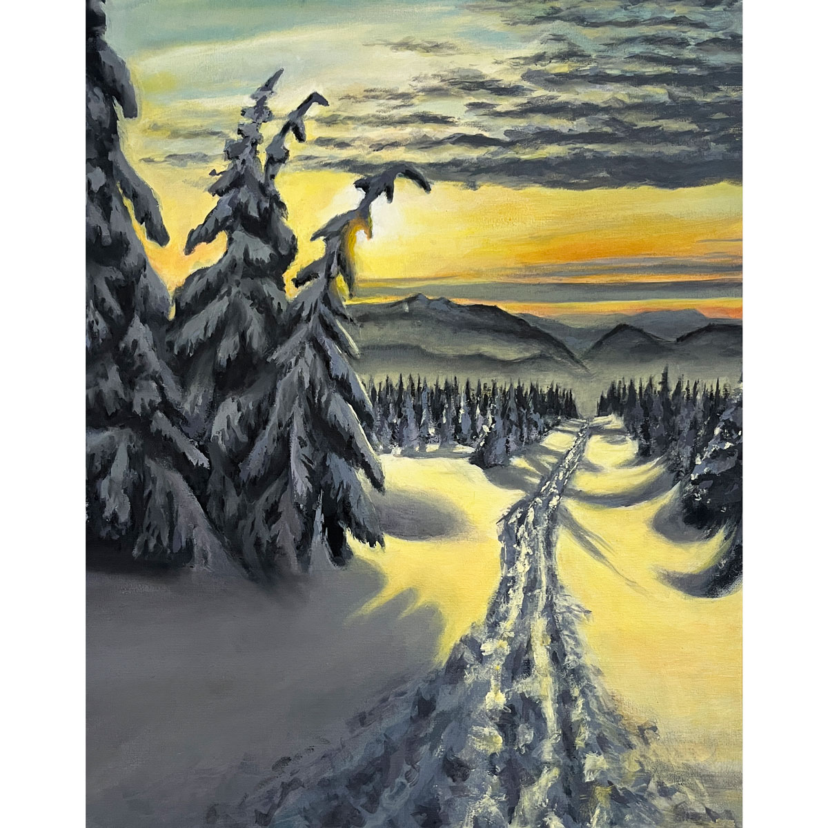 Obraz zachycuje klidnou cestu vedoucí mezi vysokými smrky, která se ztrácí v zasněžené krajině. V dálce se horizontem plíží zapadající slunce, jehož teplé světlo se jemně mísí se studenými tóny sněhu a hor. Celý motiv působí meditativně a klidně, jako okamžik z tiché zimní procházky při posledních paprscích dne. Malovala jsem ho akrylem a dotvořila olejem.