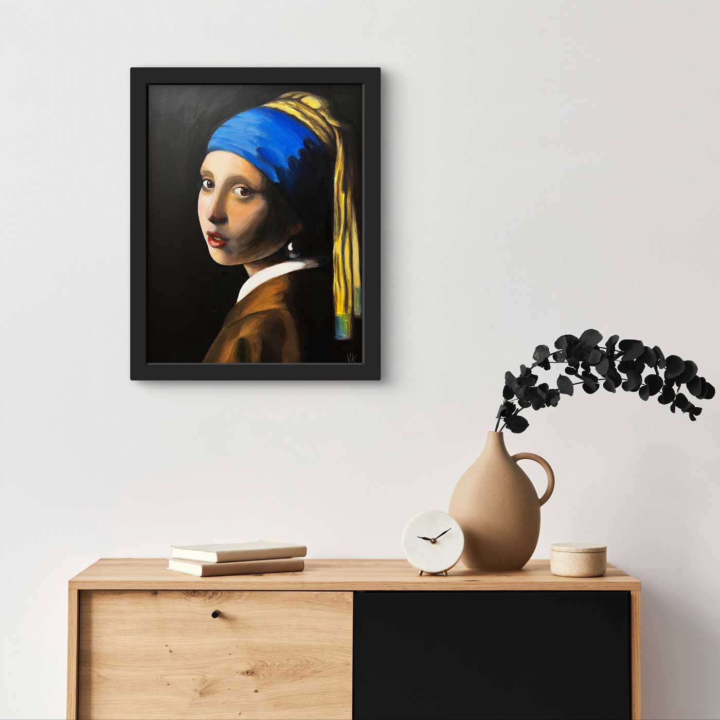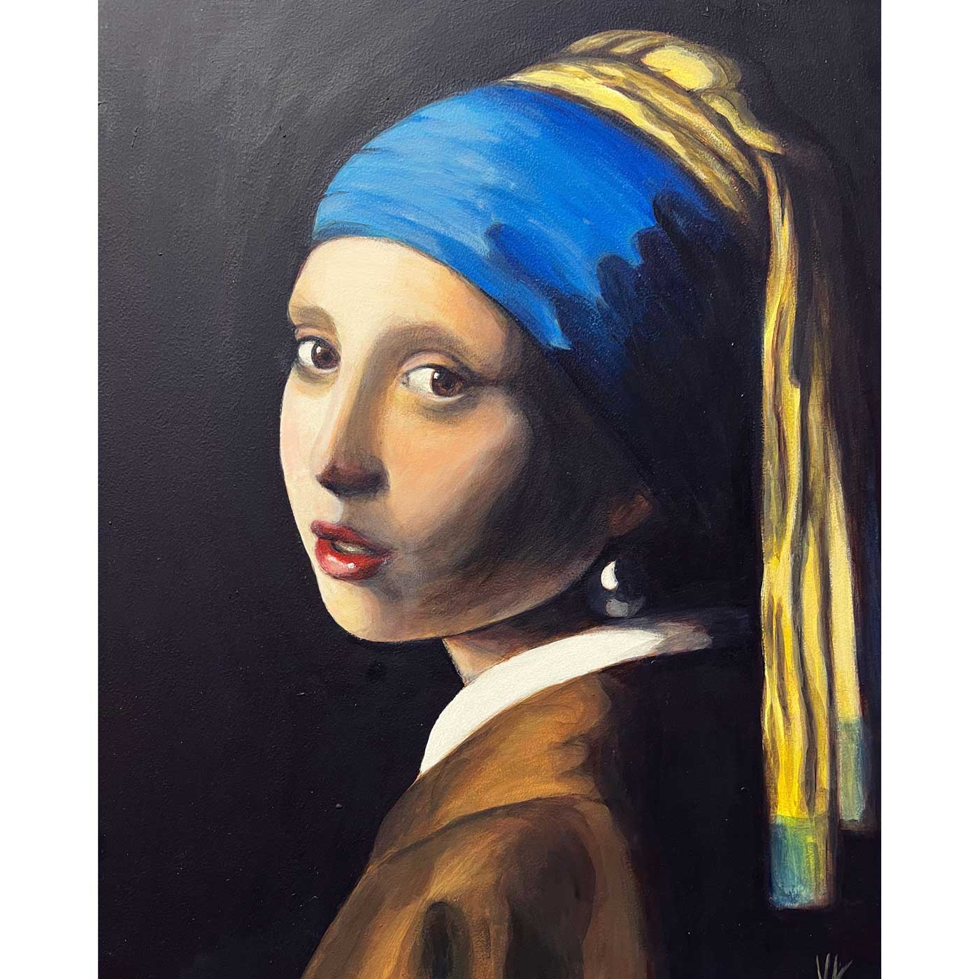 Obraz dívky s perlou zachycuje její jemný a nevinný výraz. Portrét jsem dlouho kreslila a použila na něj pouze akrylové barvy.
