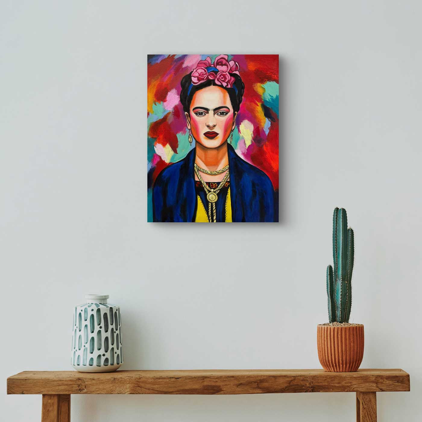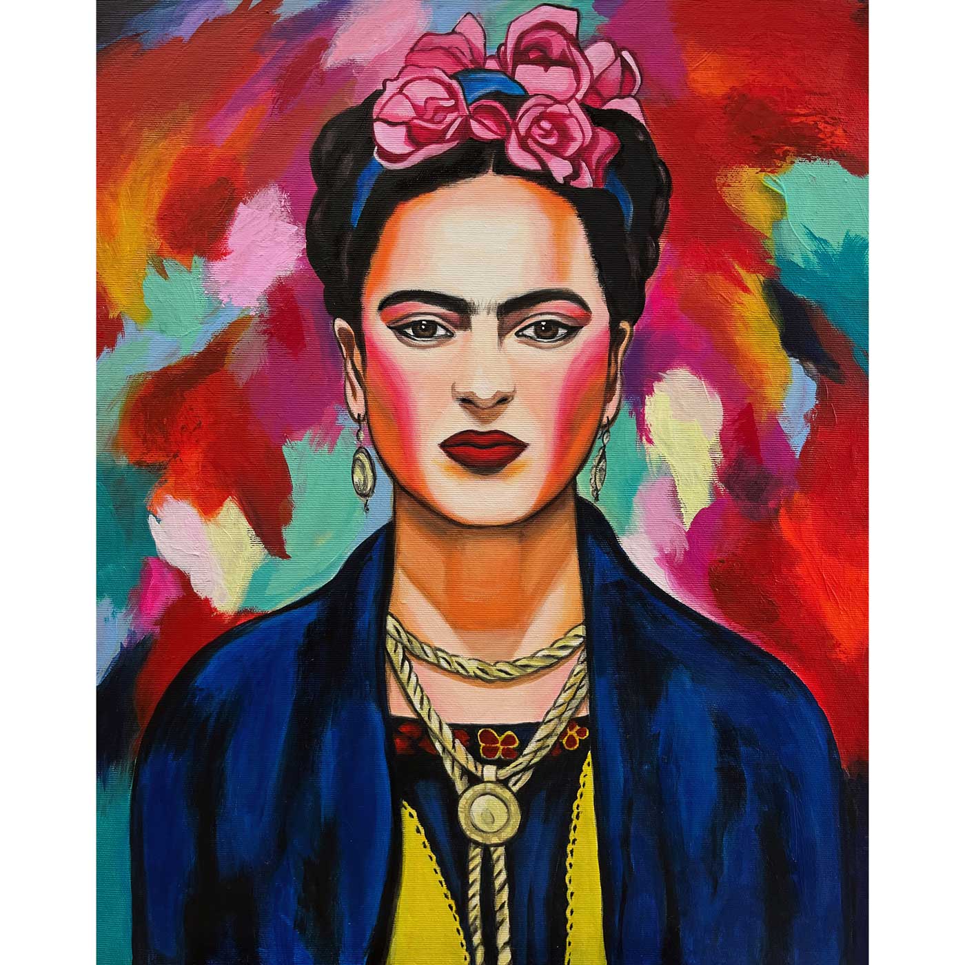 Obraz zobrazuje Fridu na výrazném, barevném pozadí s dominujícími červenými tóny, které umocňují intenzitu a emocionalitu celého portrétu. Vlasy zdobí růže, symbol krásy, zatímco výraz v obličeji dodává obrazu nekompromisní charakter. Celek působí sebevědomě, výrazně a vyzařuje vnitřní sílu i nezlomnost osobnosti. Obraz jsem malovala na přání pro mou sestru.