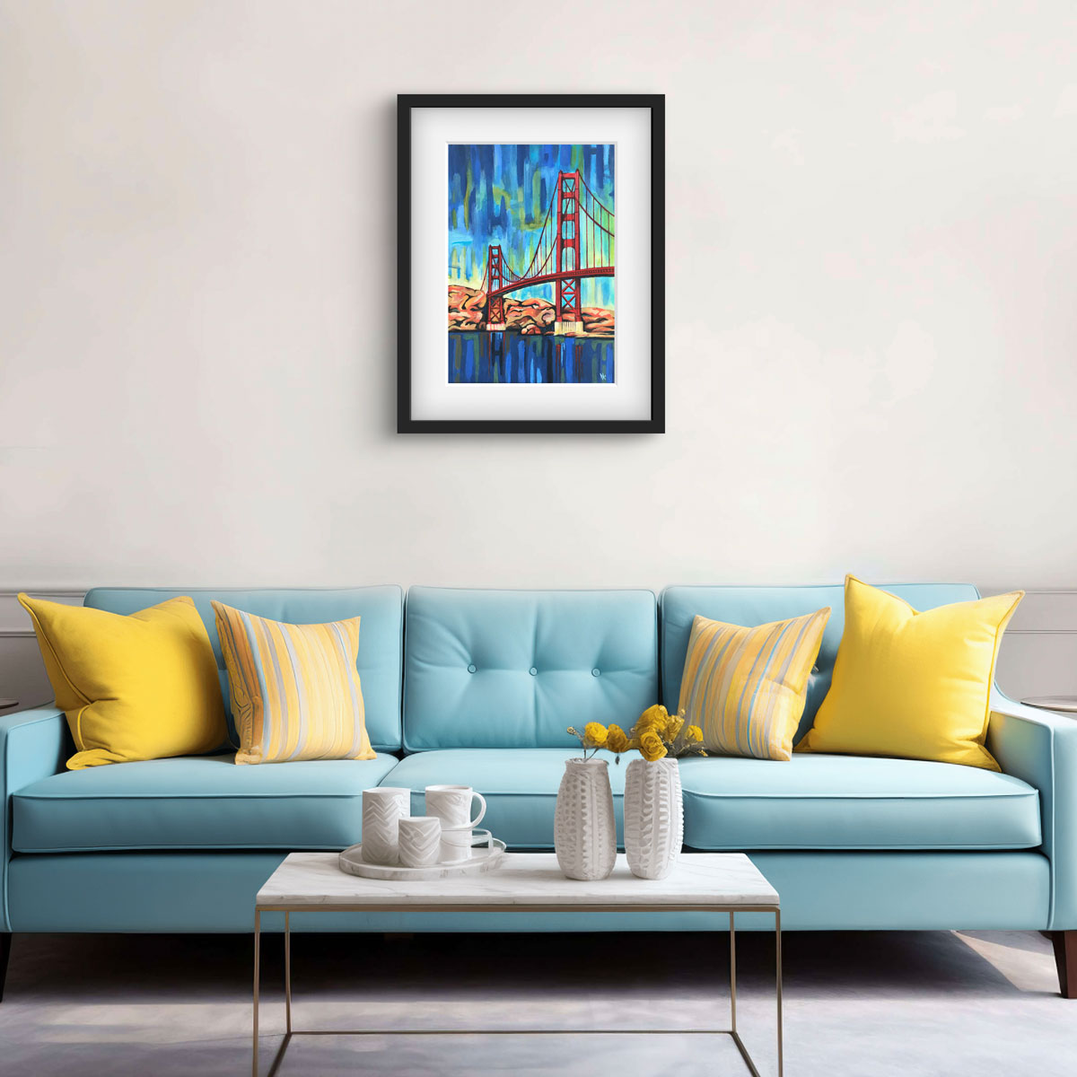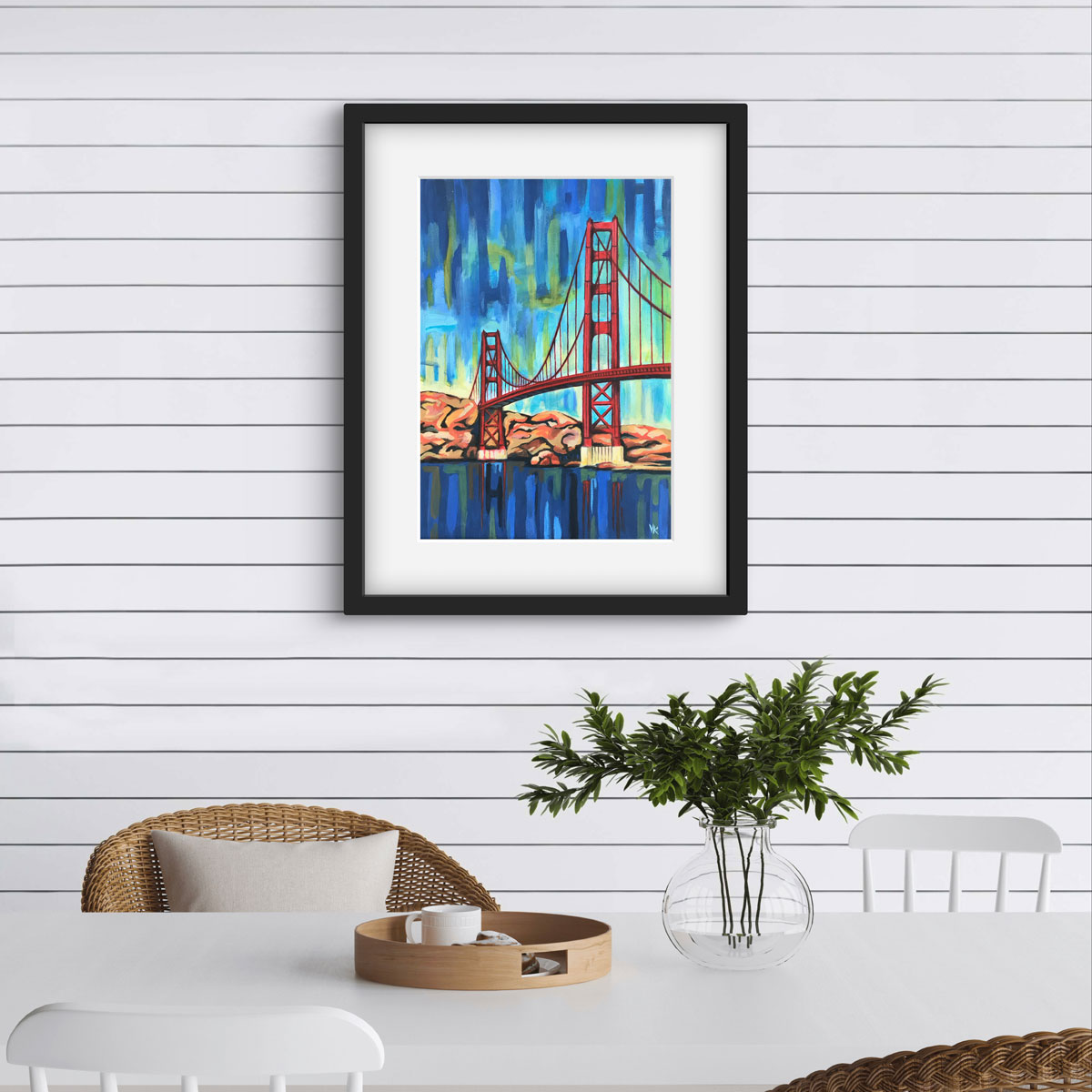 Obraz zachycuje ikonický most Golden Gate v netradičním barevném pojetí – zářivě červená konstrukce výrazně kontrastuje s chladnými odstíny modré, které dominují celému dílu. Tento kontrast podtrhuje jedinečnost a sílu symbolu, který nosím hluboko v srdci po letech, jež jsem zde strávila.
