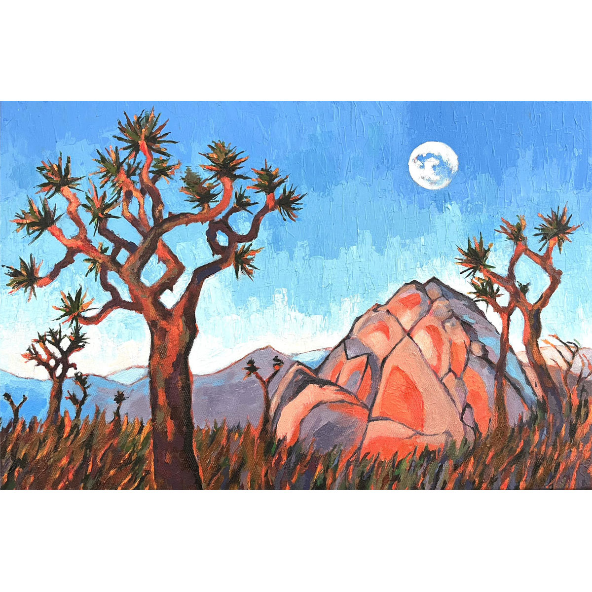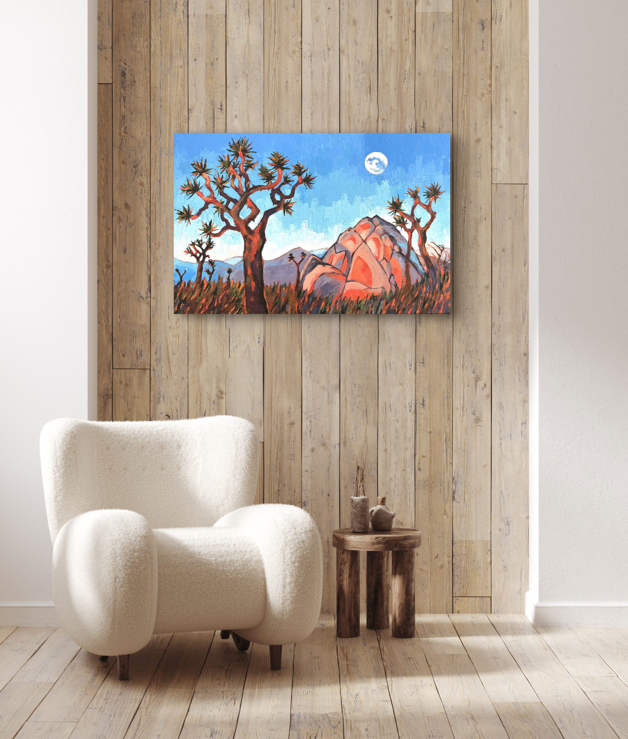 Tento obraz zachycuje ikonický strom Joshua Tree, vyrůstající osamoceně v široké, klidné pouštní krajině. Jeho nepravidelné, dramaticky větvené siluety vystupují proti teplému večernímu nebi. Hrubá textura stromu kontrastuje se vzdálenými oblými skalními útvary v pozadí. Obraz zachycuje atmosféru kalifornské přírody.