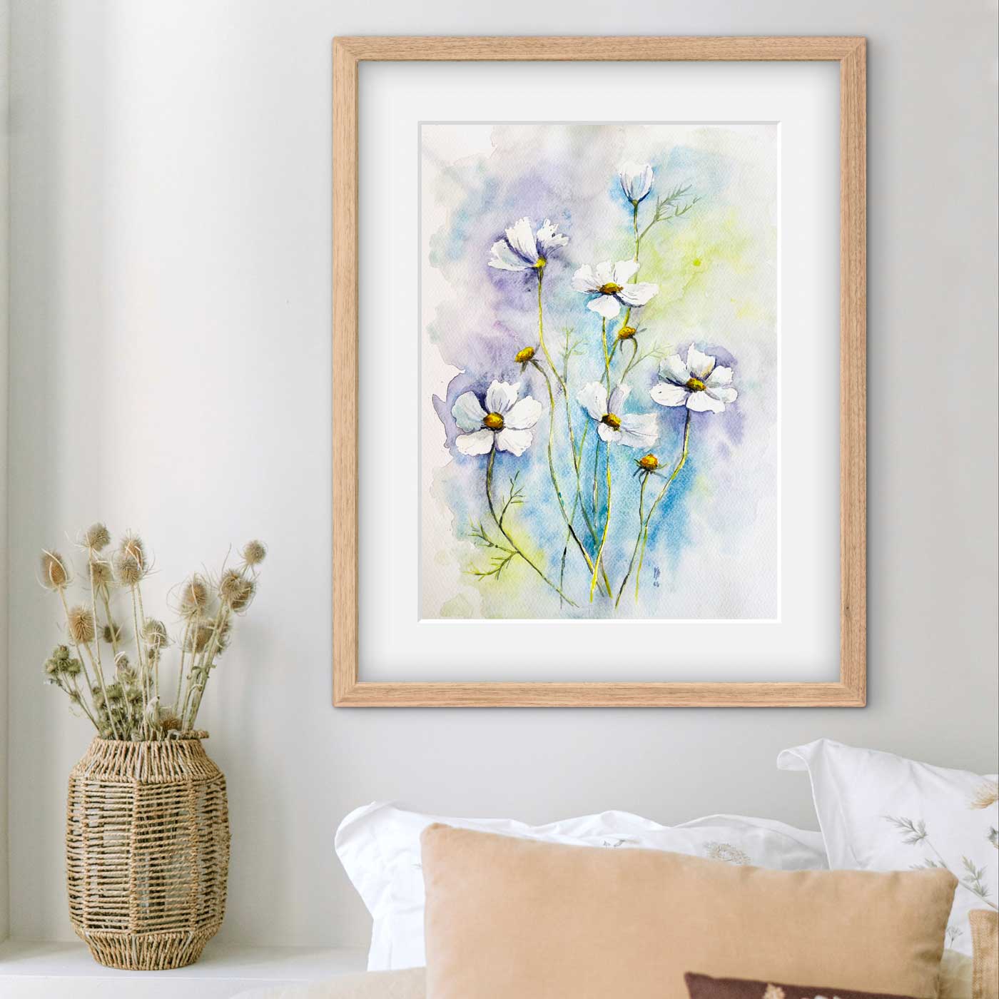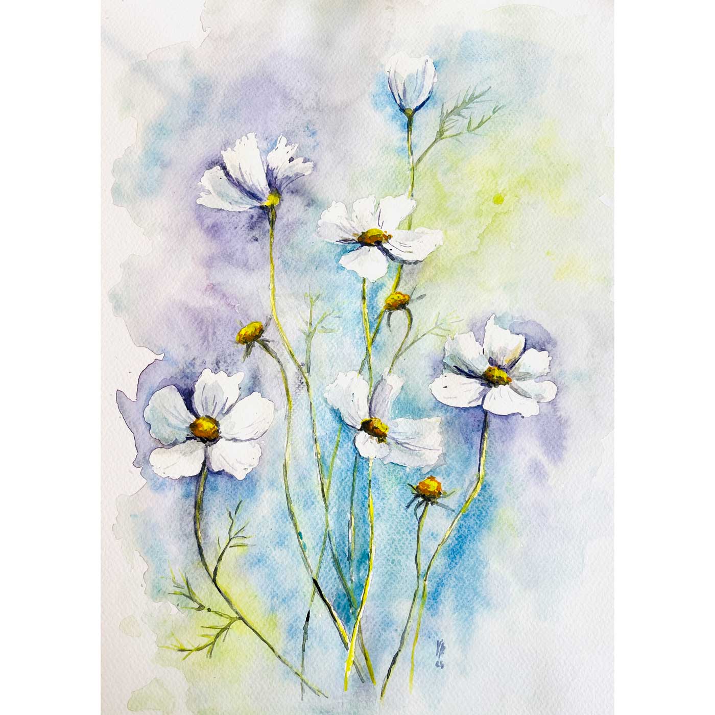 Lehký akvarelový obraz zobrazuje bílé květy na barevném pozadí. Záměrně vynechané plochy nechávají místy vyniknout bílý papír, který dodává kompozici vzdušnost a lehkost.