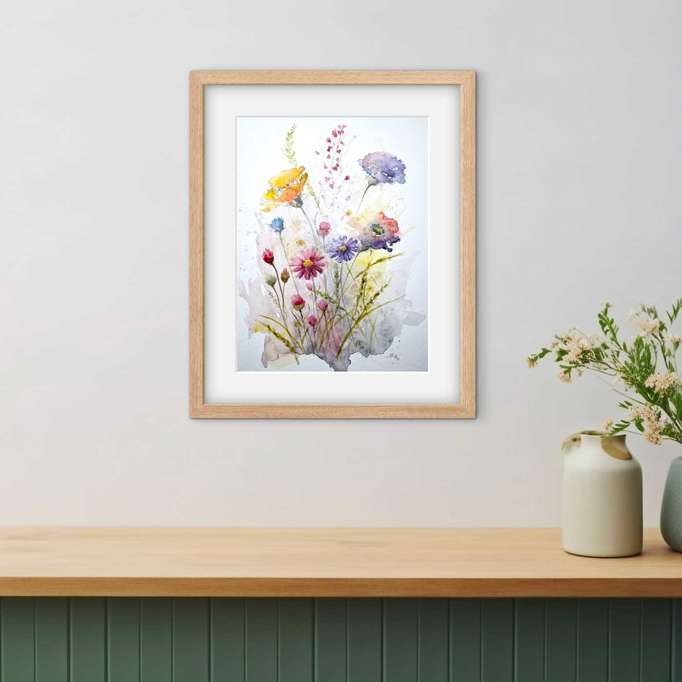 Jemný akvarelový obraz zachycuje luční louku plnou kvítí, zpracovanou lehkými vrstvami barvy. Motiv působí vzdušně a přirozeně, jako tichý dotek přírody.