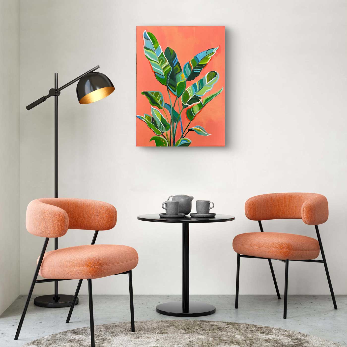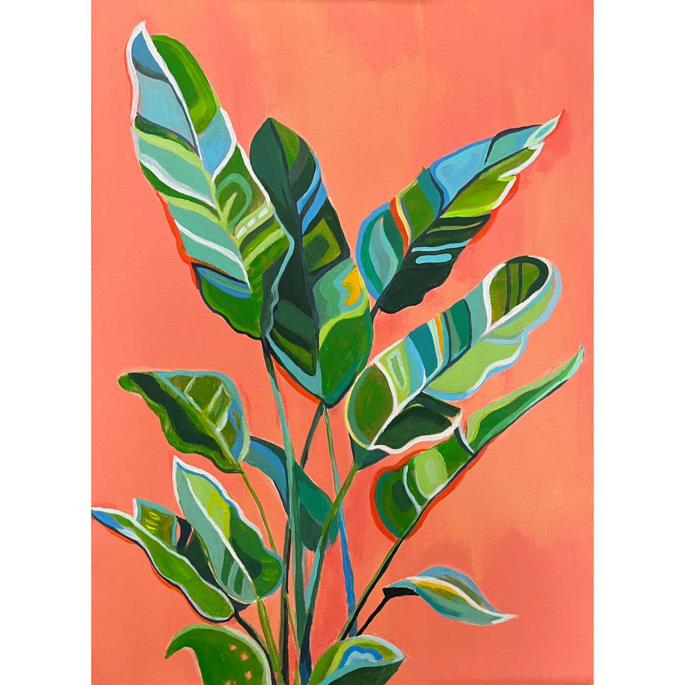 U tohoto obrazu jsem vsadila na oranžovou barvu, která tvoří hlavní základ kompozice a kterou ráda používám jako podmalbu. Motiv pokojové květiny díky tomu působí svěže s výrazem plným života a energie.