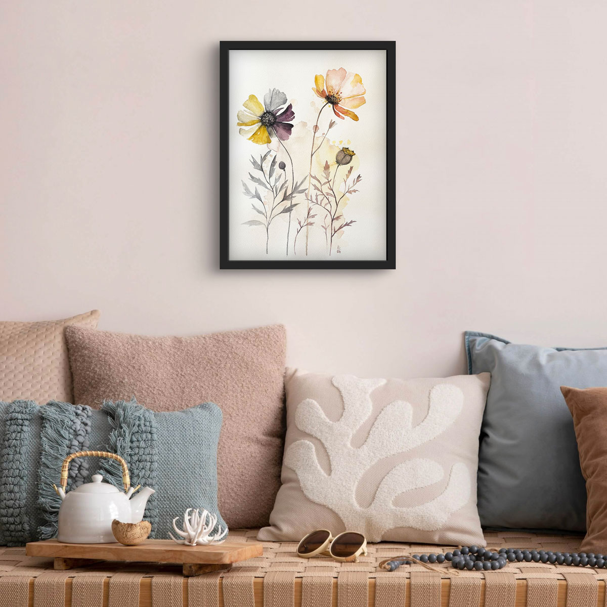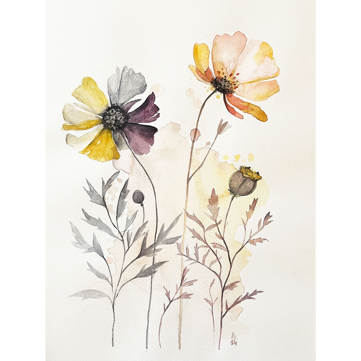 Akvarelová kresba vlčího máku, která záměrně opouští typickou červenou a nahrazuje ji tlumenými tóny starorůžové, žluté, fialové a šedé. Jemná barevnost dodává květu křehkost, nostalgii a klid – jako by šlo o vzpomínku zasutou v čase.