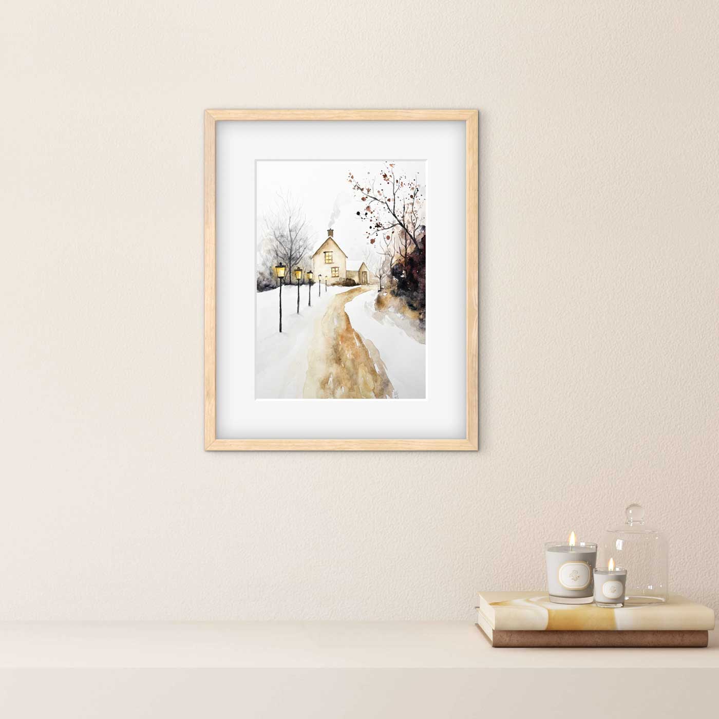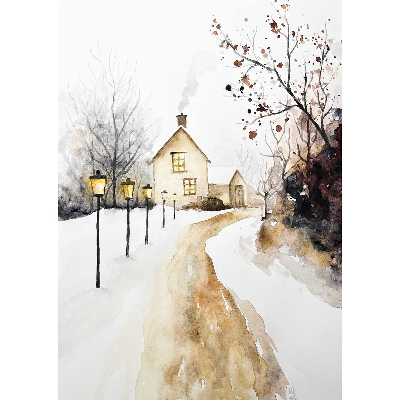 Akvarel Zimní cestička zobrazuje tichou cestu ve sněhu vedoucí k domečku. Jednoduché tahy vytvářejí minimalistickou, klidnou a poetickou atmosféru zimní krajiny. Tento obrázek jsem malovala pro mou kamarádku na přání.
