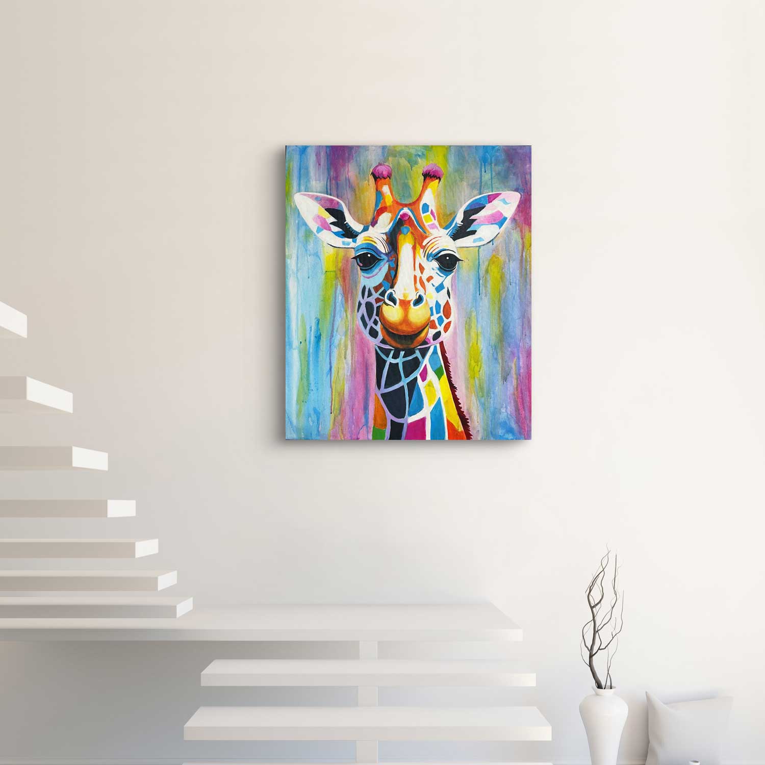 Obraz žirafy je namalován akrylovými barvami ve výrazné paletě růžových, žlutých a modrých tónů. Stylově se pohybuje na pomezí jemného street artu a moderní ilustrace. Pozadí je záměrně zjednodušené, lehce nahozené a rozlívané akvarelovým způsobem, aby nechalo vyniknout hlavní motiv. Samotná žirafa je zpracována s důrazem na detail, což jí dodává osobitý výraz a charakter. Celek působí sympaticky, hravě a vyzařuje pozitivní energii, která dokáže prostor příjemně oživit.